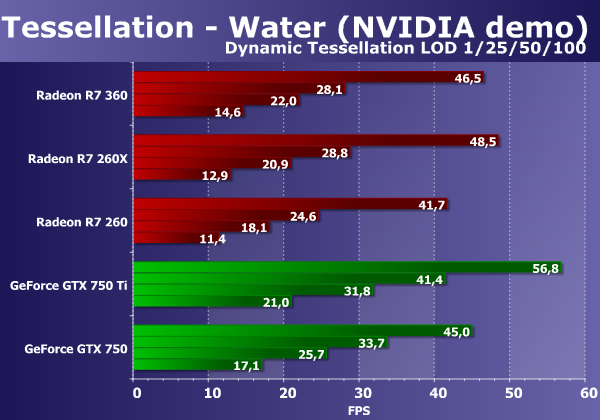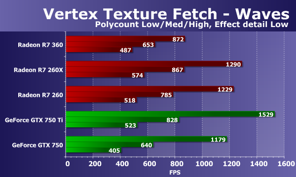 Увы, результаты Radeon R7 360 и во втором тесте вершинного текстурирования «Waves» явно не соответствуют истинному положению дел, хотя и улучшились для новинки. Впрочем, скоростные показатели плат GeForce в этом тесте довольно слабы, и новая модель AMD в сложных условиях даже с учетом плохой программной оптимизации оказывается быстрее своего прямого соперника в виде GeForce GTX 750. Рассмотрим усложненный вариант этой же задачи:
