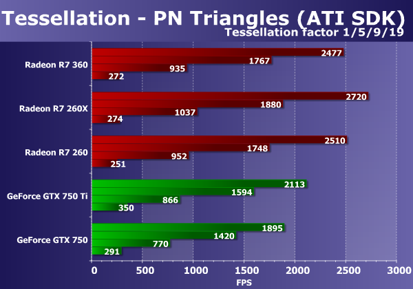 Больше интересно сравнение платы R7 360 с R7 260(X) из предыдущего семейства. Ведь новинка опережает даже более мощную Radeon R7 260X в двух тяжелых режимах, чего не должно быть, исходя из теории. Вероятно, сказывается как повышенная до 1050 МГц частота GPU, так и (даже в большей степени) программная оптимизация видеодрайверов, в которых тесселяция даже намеренно упрощается — вероятно, в последних версиях драйверов это упрощение только усугубилось.