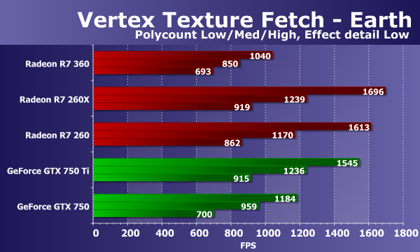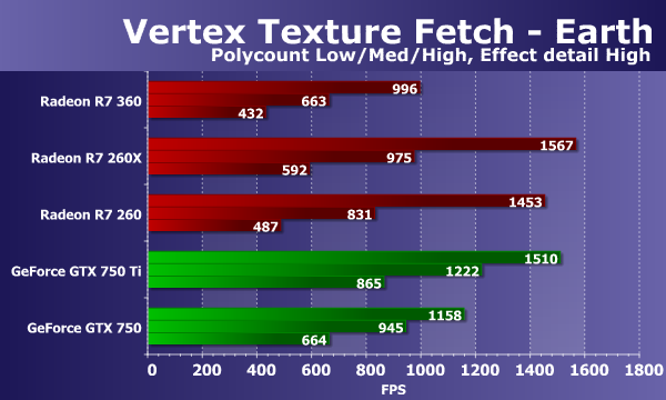 В тестах «Vertex Texture Fetch» измеряется скорость большого количества текстурных выборок из вершинного шейдера. Тесты схожи, по сути, так что соотношение между результатами карт в тестах «Earth» и «Waves» должно быть примерно одинаковым. В обоих тестах используется displacement mapping на основании данных текстурных выборок, единственное существенное отличие состоит в том, что в тесте «Waves» используются условные переходы, а в «Earth» — нет.