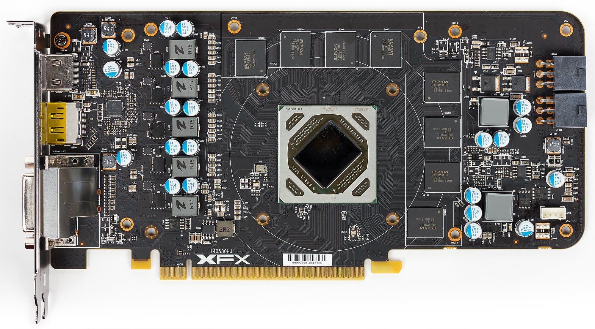 Карта имеет 4096 МБ памяти GDDR5 SDRAM, размещенной в 8 микросхемах по 4 Гбит на лицевой сторонe PCB. Микросхемы памяти Elpida (GDDR5). Микросхемы рассчитаны на номинальную частоту работы в 1500 (6000) МГц. | ![]() |