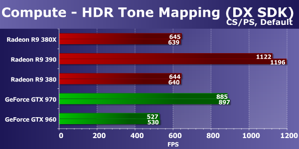 Сначала мы рассмотрим тесты, использующие вычислительные шейдеры. Их появление — одно из наиболее важных нововведений в последних версиях DX API, они уже используются в современных играх для выполнения различных задач: постобработки, симуляций и т. п. В первом тесте показан пример HDR-рендеринга с tone mapping из DirectX SDK, с постобработкой, использующей пиксельные и вычислительные шейдеры.
