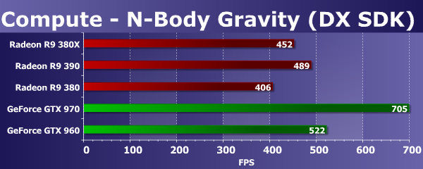 Нагрузка в этом тесте явно в пользу видеоплат GeForce, старшая GTX 970 идет впереди всех, да и младшая GeForce GTX 960 тут обогнала все модели Radeon, даже R9 390. Данная задача явно эффективнее рассчитывается на графических процессорах архитектуры Maxwell, а новая модель Radeon R9 380X, основанная на полноценном графическом процессоре Antigua/Tonga в этот раз опередила разве что Radeon R9 380, имеющей урезанную версию этого же чипа.