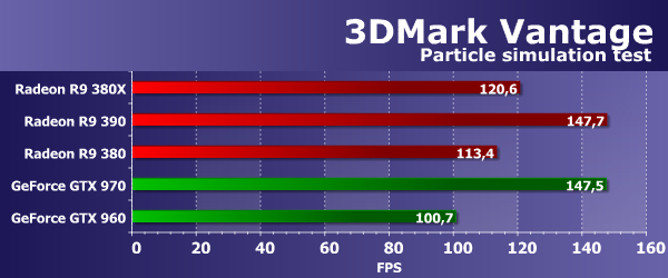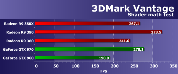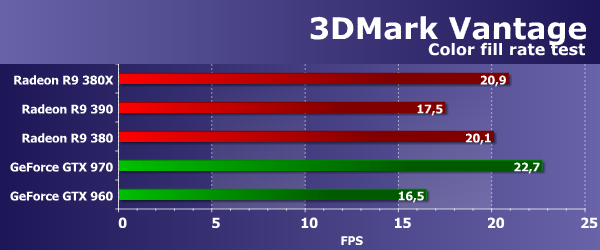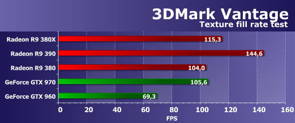 Значения производительности во втором подтесте 3DMark Vantage показывают скорость блоков ROP без учета величины пропускной способности видеопамяти (т. н. «эффективный филлрейт»), и тест измеряет именно производительность этой подсистемы. Рассматриваемая нами сегодня плата Radeon R9 380X оказалась практически на одном уровне с младшей моделью Radeon R9 380, основанной на урезанном чипе Antigua/Tonga, так как они имеют одинаковое количество и эффективность работы блоков ROP. Интереснее то, что из-за меньшей эффективности этих блоков, старшая модель R9 390 на основе Grenada даже уступила обеим платам на Antigua/Tonga.