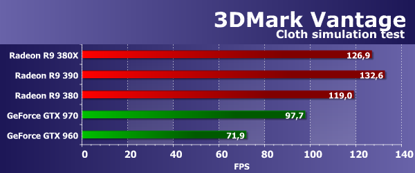 И снова мы видим, что новая видеокарта среднеценового диапазона от компании AMD в тесте показывает результат, близкий скорее к старшей из плат компании Nvidia — GeForce GTX 970. Младшая GTX 960 серьезно отстает от всех решений в данном тесте, не в силах бороться даже с простой Radeon R9 380. Feature Test 4: GPU Cloth