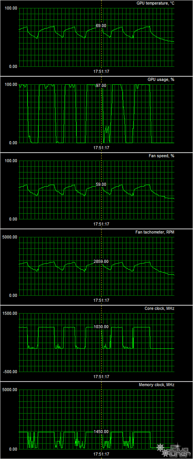 В режиме простоя в 2D вентилятор работал на частоте 1400 оборотов в минуту, при этом температура графического ядра не поднималась выше 37 градусов, а уровень шума составлял 25,5 дБА.