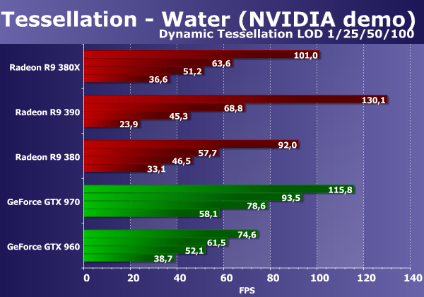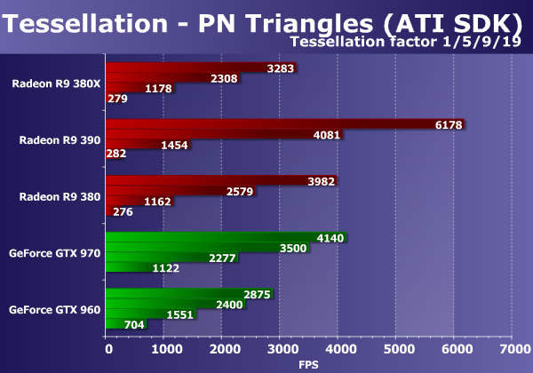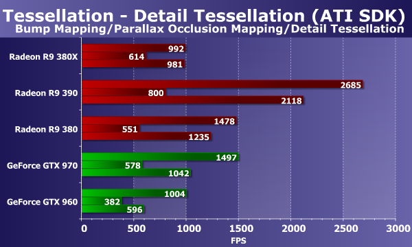 Обычно видеокарты Radeon в этом тесте показывают близкие результаты, но в этот раз получилось иначе — новая плата от компании AMD выступила явно не на всю свою силу в двух из трех подтестов, явно упираясь в недостаток программной оптимизации в драйверах, ведь с Radeon R9 380 на более старой версии Catalyst таких проблем не было отмечено. Только в подтесте с параллакс-маппингом, где требуется не геометрическая производительность, а математическая, она показывает адекватный результат, обходя Radeon R9 380 примерно на 11%, как и должно быть по теории. При этом новинка опередила также и обе модели GeForce, даже более дорогую GTX 970.