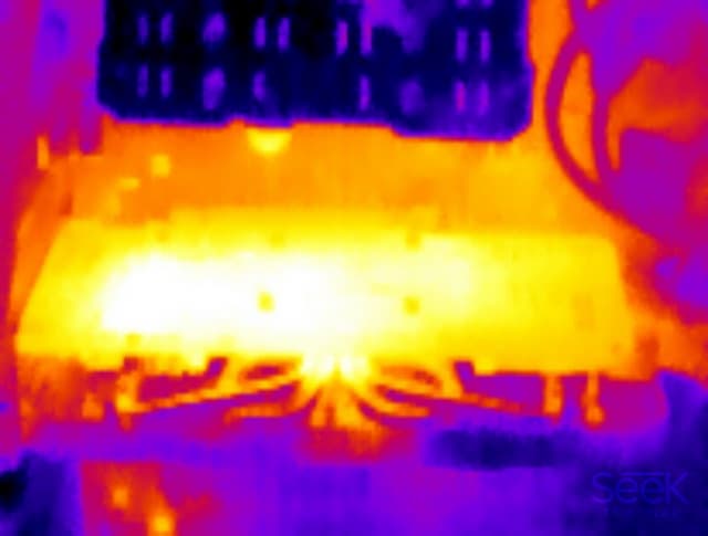 Хорошо видно, что наиболее нагрета область в районе преобразователей напряжения (даже нагрев GPU меньше).