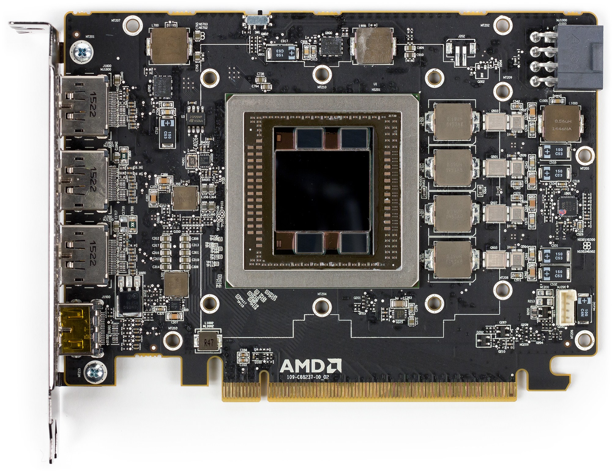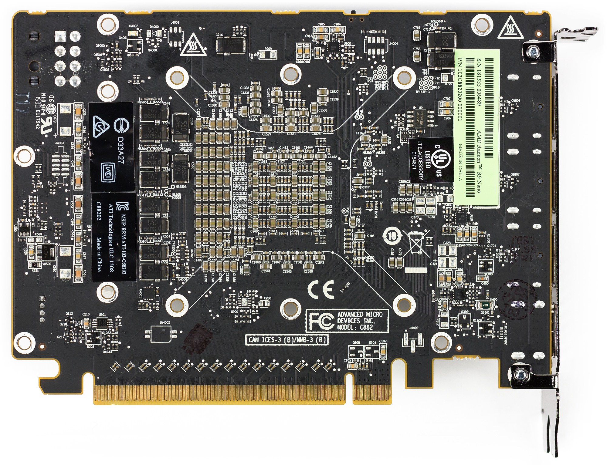 Поскольку R9 Nano обладает тем же ядром, что и R9 Fury X, то логично сравнивать именно эти две карты. Прекрасно видно, что плата у R9 Nano стала короче — это стало возможно из-за упрощения системы питания, которая получила меньшее число фаз, но управляется тем же цифровым контроллером. Разъем питания стал единственным и переехал на задний торец. Собственно, отличие от Fury X в том, что жестко зафиксирован верхний предел энергопотребления в 175-180 Вт, и программное обеспечение постоянно регулирует частоту работы GPU с тем, чтобы не выходить за пределы термопакета. Отсюда и плавающая частота 900—962 МГц, и соответствующее снижение производительности относительно Fury X.