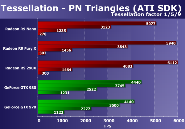 В этом тесте применяется достаточно сложная геометрия, поэтому сравнение геометрической мощи различных решений вполне актуально. Представленные в материале решения неплохо справляются с легкой геометрической нагрузкой, показывая достаточно высокую скорость. Хотя в легких условиях графические процессоры Hawaii и Fiji в составе плат Radeon работают отлично, в двух тяжелых режимах платы Nvidia выходят вперед. И в этих самых сложных режимах новая плата модели Radeon R9 Nano оказалась в разы хуже конкурирующих с ней плат GeForce, что вполне объяснимо большим количеством геометрических блоков у последних.