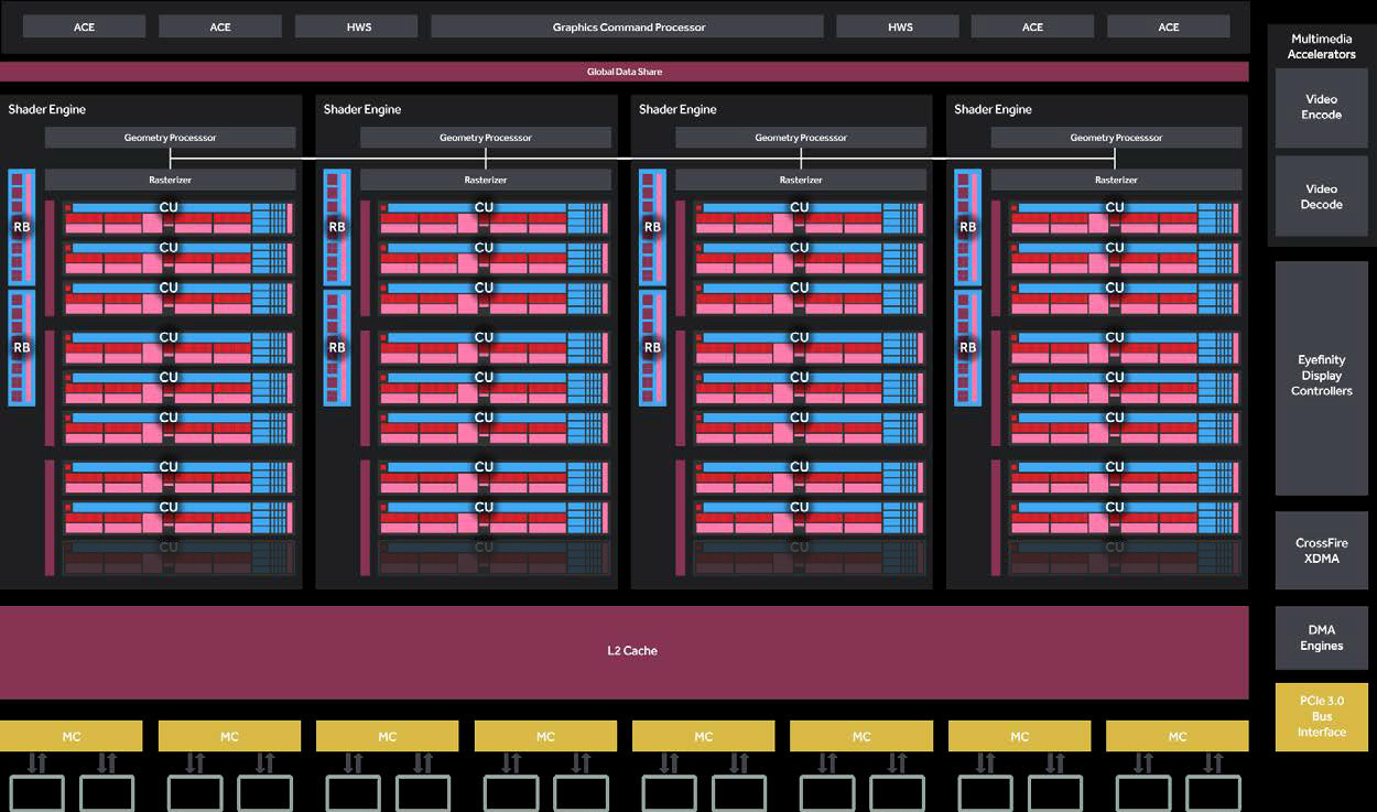 Рассмотрим схему младшей версии графического процессора Polaris 10 Pro (по клику на изображении доступна увеличенная версия иллюстрации):