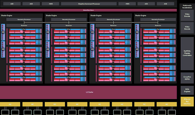 Базовым блоком архитектуры является вычислительный блок Compute Unit (CU), из которых собраны все графические процессоры AMD. Вычислительный блок CU имеет выделенное локальное хранилище данных для обмена данными или расширения локального регистрового стека, а также кэш-память первого уровня с возможностью чтения и записи и полноценный текстурный конвейер с блоками выборки и фильтрации, он разделен на подразделы, каждый из которых работает над своим потоком команд. Каждый из таких блоков занимается планированием и распределением работы самостоятельно. Схема графического процессора аналогична Polaris 10 (по клику на изображении доступна увеличенная версия иллюстрации):