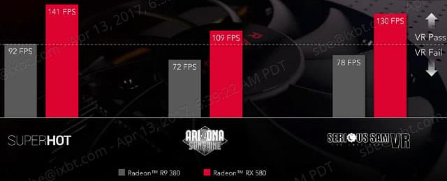 Если в VR-приложении SuperHot и устаревшая видеокарта дает 92 FPS, чего достаточно для комфорта (при этом RX 580 достигла впечатляющих 141 FPS), то в Arizona Sunshine и Serious Sam VR видеокарта Radeon R9 380 способна обеспечить лишь 72 и 78 FPS соответственно, чего мало для виртуальной реальности. И это не шутки, при низкой частоте кадров в VR-шлеме возможен не просто легкий дискомфорт, но и ощутимые физические недомогания в виде головокружения, связанные с обманом мозга. Так что для желающих опробовать VR мощный графический процессор попросту обязателен, и Radeon RX 580 — неплохой вариант для такого апгрейда.