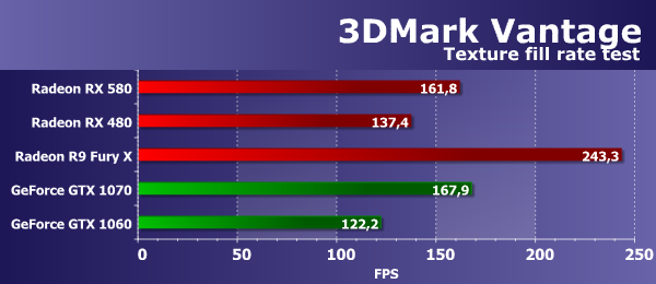 Синтетические тесты из пакета 3DMark Vantage могут показать нам другие результаты, на что мы и надеемся. Feature тесты из этого тестового пакета обладают поддержкой DirectX 10, до сих пор актуальны и интересны тем, что отличаются от наших и реже упираются в ПСП. При анализе результатов видеокарты Radeon RX 580 в этом пакете мы наверняка сделаем какие-то новые и полезные выводы, ускользнувшие от нас в тестах из пакетов семейства RightMark. Feature Test 1: Texture Fill