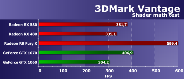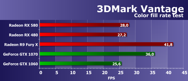 Цифры второго подтеста 3DMark Vantage обычно показывают производительность блоков ROP, без учета величины пропускной способности видеопамяти (т. н. «эффективный филлрейт»), и тест измеряет именно производительность ROP. Любопытно, что рассматриваемая нами сегодня плата Radeon RX 580 опередила свою предшественницу лишь на 3%, что ниже разницы по тактовой частоте, а количество блоков ROP у этих GPU одинаковое, да и оптимизации по сжатию данных не изменились. Снова упор в ПСП?