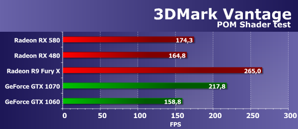 Если сравнивать скорость заполнения сцены новой видеокартой компании AMD с результатами ускорителей Nvidia в этом тесте, то сегодняшняя новинка показала скорость заполнения сцены на 9% быстрее, чем GeForce GTX 1060, хоть и отстала от более дорогой модели GTX 1070. Лидером же теста в целом стала хоть и старая, но весьма мощная видеокарта Radeon R9 Fury X. Feature Test 3: Parallax Occlusion Mapping