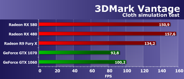 В данном случае важны и математическая и текстурная производительность, и в этой «синтетике» из 3DMark Vantage старшая плата Radeon семейства RX 500 на базе архитектуры Polaris показала хороший результат, опередив аналогичную модель предыдущего семейства Radeon RX 480 на 6%, что полностью соответствует теоретическим данным. Старшая же Radeon оказалась заметно быстрее обеих, что также должно быть, исходя из теории. Конкурирующая с новинкой GeForce GTX 1060 в этом тесте показала результат на 10% хуже, и именно небольшое повышение частоты GPU и дало RX 580 уже вполне ощутимое преимущество в этой задаче. Feature Test 4: GPU Cloth