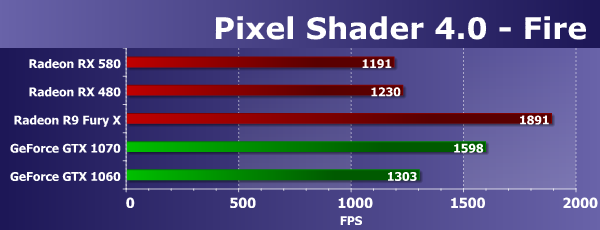 Похоже, что Radeon RX 580 в этом тесте снова упирается в пропускную способность памяти. Новая Radeon на чипе Polaris 20 снова оказалась на одном уровне с Radeon RX 480, проиграв при этом главному конкуренту от компании Nvidia и сильно отстав от двух старших решений: Radeon на базе чипа Fiji и GeForce на среднем Pascal. Рассмотрим второй тест шейдерных вычислений, который носит название Fire. Он тяжелее для ALU, и текстурная выборка в нем только одна, а количество инструкций типа sin и cos увеличено вдвое, до 130. Посмотрим, что изменилось при увеличении нагрузки: