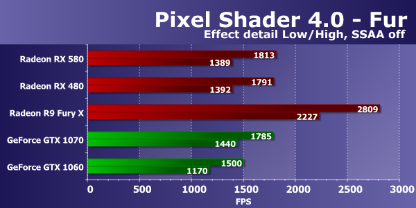 В задачах процедурной визуализации меха с большим количеством текстурных выборок, решения компании AMD заняли лидирующие позиции еще со времен выпуска первых видеочипов на базе архитектуры GCN. Платы Radeon до сих пор являются лучшими в этих сравнениях, что говорит о высокой эффективности выполнения ими таких программ, но конкретно графические решения Polaris немного сдали позиции, как мы отмечали в прошлый раз. Анонсированная сегодня видеокарта Radeon RX 580 показала скорость, равную RX 480 (это говорит об упоре в ПСП), сильно отстав от более мощного решения в виде Radeon R9 Fury X.