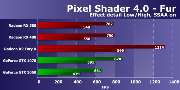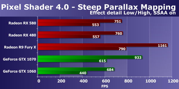 Более сложный режим не сильно изменил соотношение сил в нашем сравнении. Графические решения AMD Radeon и в этом D3D10-тесте пиксельных шейдеров всегда работали эффективнее конкурирующих плат GeForce, и только самые новые модели GeForce, основанные на архитектуре Pascal, могут поспорить с ними. Но и то не при равном позиционировании, ведь вышедшая сегодня старшая модель семейства Radeon RX 500 показала результат явно выше уровня GeForce GTX 1060, которая уступила новинке до 26%, а GTX 1070 была лишь немногим быстрее.