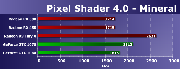 Следующая пара тестов пиксельных шейдеров содержит минимальное количество текстурных выборок для снижения влияния производительности блоков TMU. В них используется большое количество арифметических операций, и измеряют они именно математическую производительность видеочипов, скорость выполнения арифметических инструкций в пиксельном шейдере.