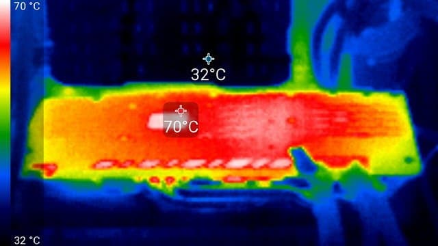 Максимальный нагрев 77 градусов — на печатной плате в вырезе на пластине с обратной стороны. На фотографии получилось меньше, так как снято с большего расстояния.