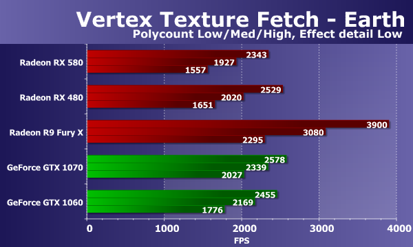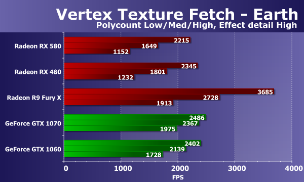 В тестах «Vertex Texture Fetch» измеряется скорость большого количества текстурных выборок из вершинного шейдера. Тесты схожи, по сути, так что соотношение между результатами карт в тестах «Earth» и «Waves» должно быть примерно одинаковым. В обоих тестах используется displacement mapping на основании данных текстурных выборок, единственное существенное отличие состоит в том, что в тесте «Waves» используются условные переходы, а в «Earth» — нет.