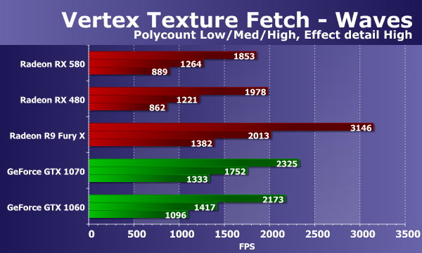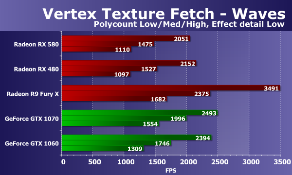 Рассмотрим результаты второго теста текстурных выборок из вершинных шейдеров. Тест «Waves» отличается меньшим количеством выборок, зато в нем используются условные переходы. Количество билинейных текстурных выборок в данном случае до 14 («Effect detail Low») или до 24 («Effect detail High») на каждую вершину. Сложность геометрии изменяется аналогично предыдущему тесту.