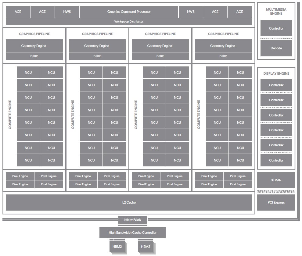 Полноценный графический процессор Vega 10 содержит 4 движка асинхронного исполнения команд, 4 модифицированных геометрических движка и 64 вычислительных блока Compute Unit нового поколения — серьёзно переделанные, по сравнению с предыдущими архитектурами, как заверяют представители AMD. Всего в составе этих вычислительных блоков находится 4096 потоковых процессоров, 256 текстурных блоков и 64 блока ROP. Соответственно, по количеству блоков можно понять, что это топовый GPU, предназначенный сразу для нескольких рынков: игрового, вычислительного, профессиональной графики и т. д. Рассмотрим схему нового графического процессора (по клику на изображении доступна увеличенная версия иллюстрации):