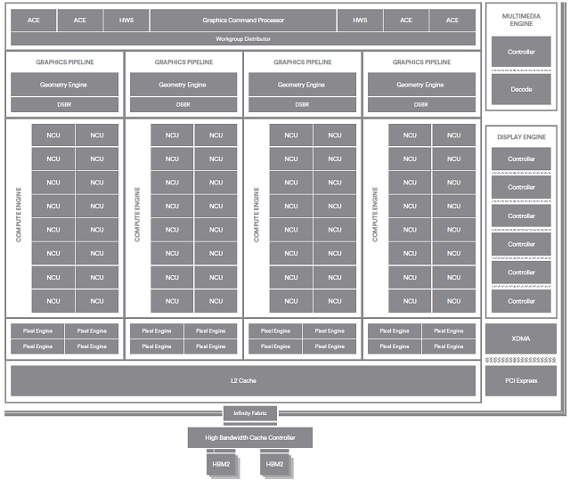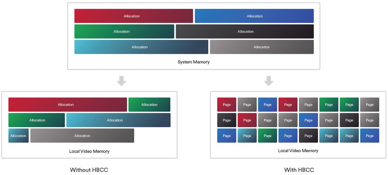 Для того, чтобы HBM2-память работала как кэш для системной памяти, энергонезависимой памяти (твердотельные SSD-накопители) или даже сетевых накопителей, нужно специальное управление всей этой иерархией — чтобы GPU брал данные из одного места и сохранял их в других по мере необходимости. Для решения этих задач в графический процессор Vega был внедрен новый контроллер высокопроизводительной кэш-памяти — High Bandwidth Cache Controller (HBCC).