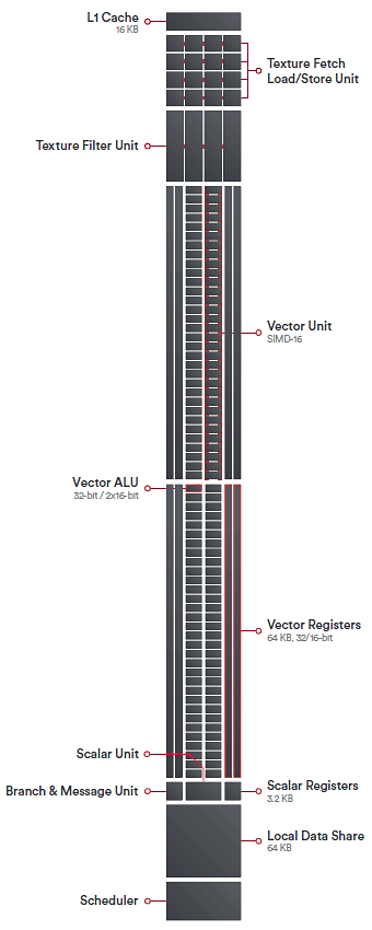 Графический процессор Vega 10 относится к архитектуре Graphics Core Next, хоть и значительно модифицированной. Базовым блоком архитектуры является вычислительный блок Compute Unit (CU), из которых собраны все графические процессоры AMD. Вычислительный блок CU имеет выделенное локальное хранилище данных для обмена данными или расширения локального регистрового стека, а также кэш-память первого уровня с возможностью чтения и записи и полноценный текстурный конвейер с блоками выборки и фильтрации, он разделен на подразделы, каждый из которых работает над своим потоком команд. Каждый из таких блоков занимается планированием и распределением работы самостоятельно.
