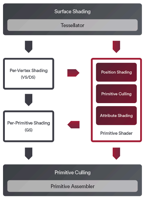 Более того, AMD уже некоторое время выступает за довольно радикальное изменение существующего геометрического конвейера и введение новых типов шейдеров. Каждая стадия существующего графического конвейера имеет свои недостатки, обусловленные ограничениями старых GPU, но новые графические процессоры их не имеют и являются более гибкими. Специалисты компании предлагают ввести Primitive Shaders — новую аппаратную стадию конвейера, которая объединяет проходы вершин и примитивов и позволит отбрасывать невидимые примитивы очень рано, повысив общую эффективность работы.