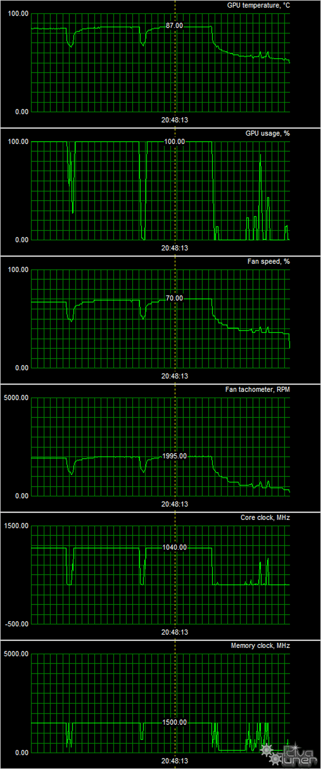 В режиме максимальной нагрузки в 3D температура достигала 87 °C, вентиляторы при этом раскручивались до 1995 оборотов в минуту, шум вырастал до 46 дБА. Это, безусловно, очень высокий уровень шума, так что ценителям тишины эта карта не подойдет.