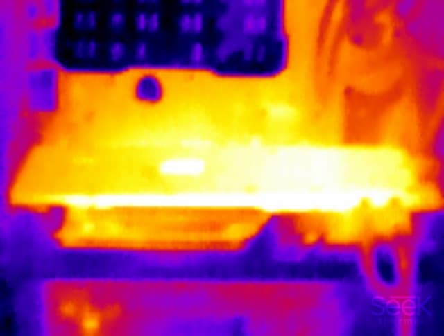 На тыльной стороне есть пластина с вырезом в районе GPU; естественно, наиболее нагретая область именно там: четко выраженный прямоугольник. Еще одна нагретая, но более размытая область есть в районе преобразователей напряжения.