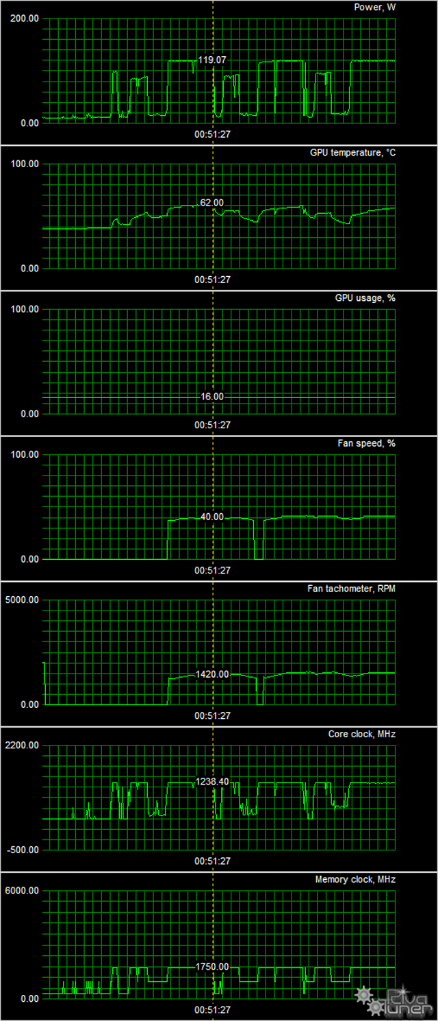 - Измерения проводились на расстоянии 50 см от видеокарты на уровне системы охлаждения.