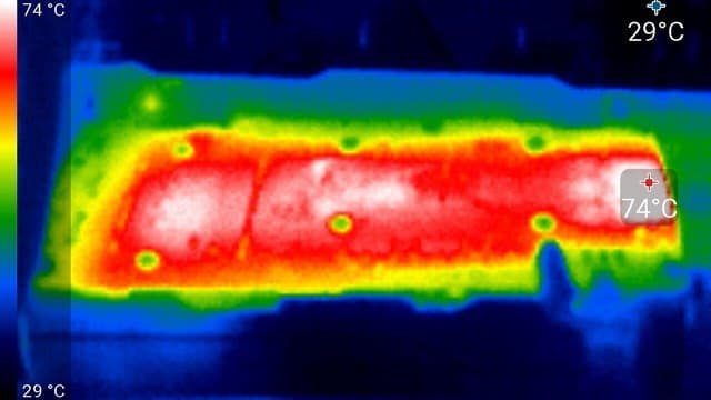 Наибольший нагрев — с оборотной стороны в зоне микросхем памяти.