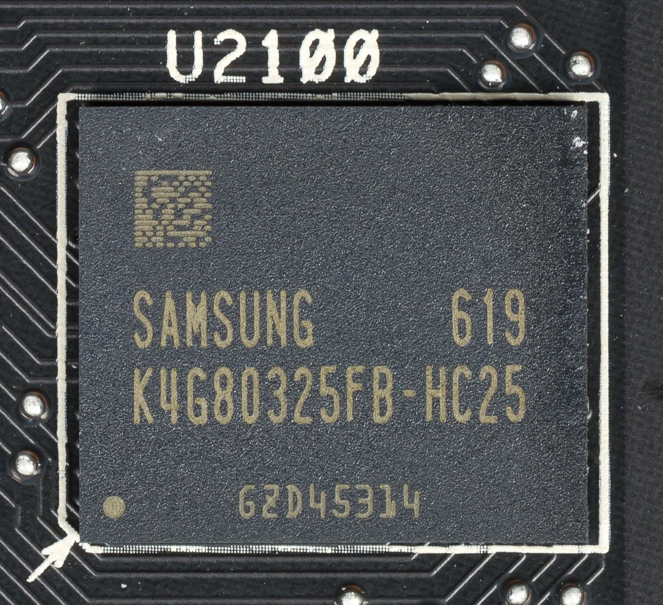 Карта имеет 8 ГБ памяти GDDR5 SDRAM, размещенной в 8 микросхемах по 8 Гбит на лицевой стороне PCB. Микросхемы памяти Samsung (GDDR5) рассчитаны на номинальную частоту работы в 2000 (8000) МГц. | ![]() |