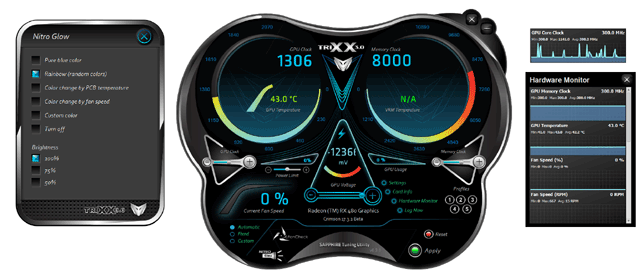В режиме разгона (по умолчанию) частоты у данного ускорителя повышены относительно стандартных параметров референс-карты на 3,1%, что может обеспечить прирост производительности на 2,5%-3% в зависимости от разрешения и режима работы (то есть на практике заметить это почти невозможно). На карте имеется переключатель режимов работы: разгон/номинальный (референс).