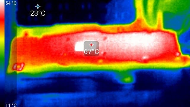 Наибольший нагрев — в зоне отверстия в пластине напротив GPU. Температура на фото меньше, так как снято с большего расстояния.
