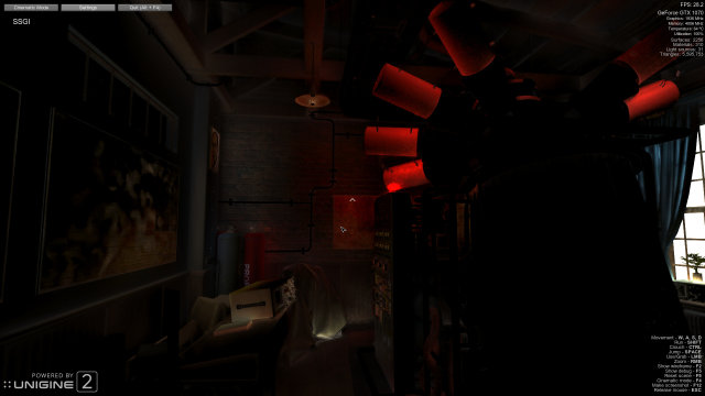 Из недостатков отметим единственную комнату не очень большого размера, хоть и напичканную интерактивными объектами и графическими эффектами. В бенчмарках с одной сценой зачастую получается небольшой разброс по частоте кадров, когда минимальное значение не так уж далеко от максимального. На наш взгляд, было бы лучше иметь несколько сцен с отличающейся нагрузкой на GPU, но мы понимаем, что это изрядно бы добавило сложностей при недешёвом процессе разработки. Ещё мы бы хотели иметь регулировку сложности геометрии с применением тесселяции, как в бенчмарке Heaven. А то настройка качества есть для шейдеров и текстур, а изменения уровня геометрической детализации нет (хотя разница в количестве рассчитываемых треугольников из-за разного количества эффектов наблюдается, но сама детализация объектов не меняется). Также было бы полезно добавить в статистику отображение количества занятой видеопамяти и загрузку не только GPU, но и CPU, лучше отдельно по ядрам.