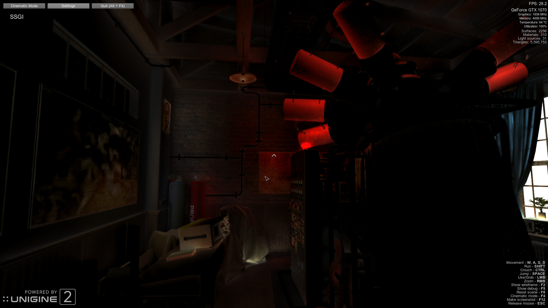 Но нас больше волнуют возможности, связанные с тестированием графических процессоров. И в этом новый тест не подвёл. Superposition основан на движке Unigine 2, который позволяет получить фотореалистичное изображение и поддерживает многие из современных технологий 3D-графики, в том числе уникальную технологию расчёта глобального освещения при помощи трассировки лучей в экранном пространстве — SSRTGI (Screen-Space Ray-Traced Global Illumination). Этот алгоритм трассировки лучей в режиме реального времени приближает освещение сцен к реализму.