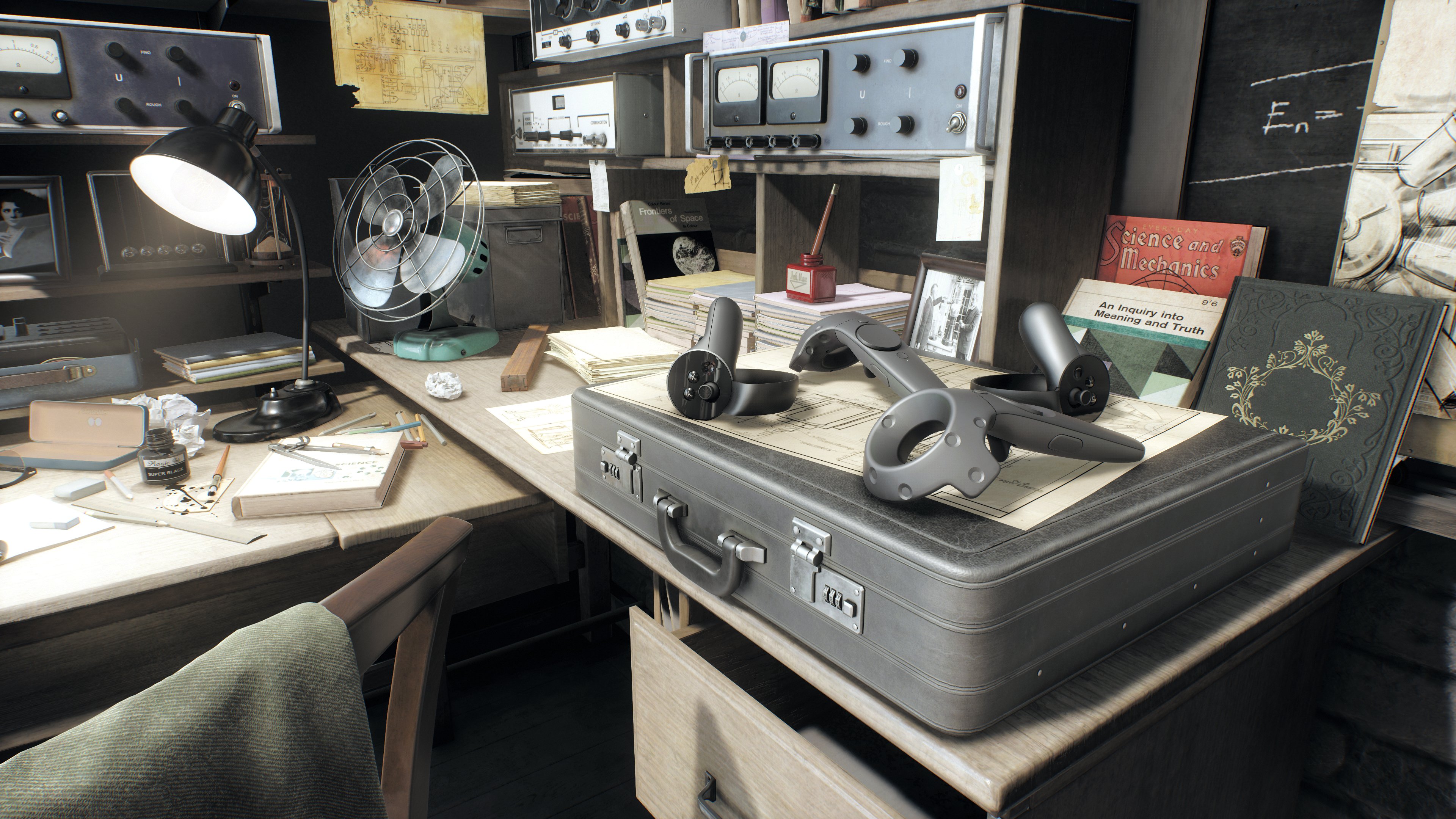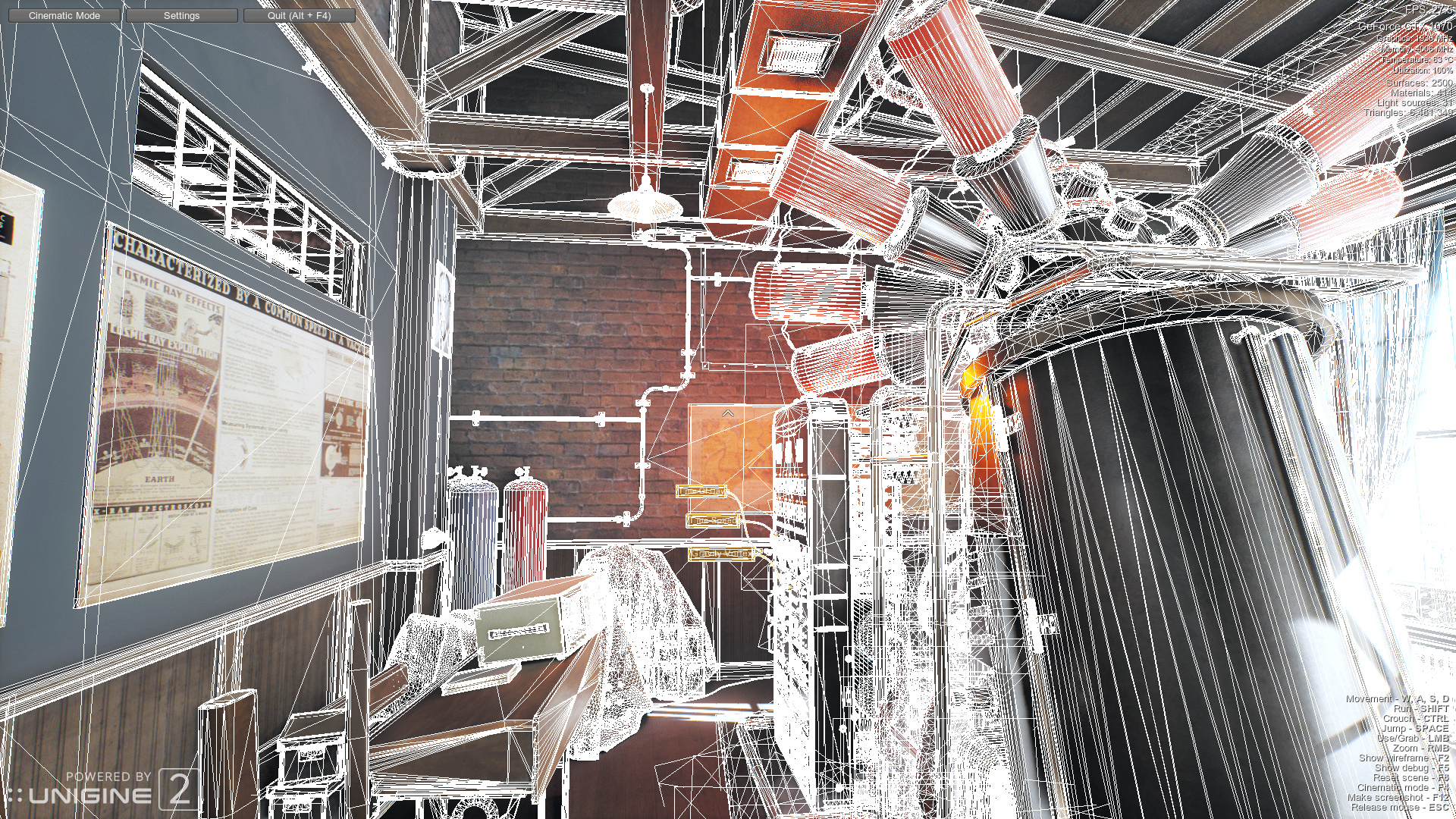 У Superposition даже есть некое подобие сюжета — наблюдатель переносится в 50-е годы прошлого века в заброшенную лабораторию загадочно исчезнувшего физика и имеет возможность внимательного изучения проводимых одиноким профессором экспериментов, а заодно попробует выяснить, куда же пропал этот ученый. Эти возможности доступны в виде интерактивных мини-игр, в которые можно поиграть при запуске Superposition в соответствующем режиме. Физический движок Unigine позволил использовать в Superposition более 900 интерактивных объектов в сцене, и играться с ними действительно интересно — можно снять шляпу с вешалки и пытаться забросить её обратно при разной гравитации, поиграть в дротики, нарисовать что-то мелом на доске и т. д. и т. п.