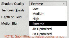 Shaders Quality — выбор качества шейдеров, возможные значения настройки: Low, Medium, High, Extreme, 4K Optimized или 8K Optimized. Разница в производительности между этими значениями огромная, с каждым шагом настроек добавляются такие эффекты, как тени, постэффекты, глобальное освещение и т. п. Поэтому, если при Low-настройках на GeForce GTX 1070 получается более 128 FPS, то Medium снижает скорость до 95 FPS, High — до 69 FPS, а Extreme и вовсе до 27 FPS. «Оптимизированные» же значения настройки снижают требования к GPU, по сравнению с Extreme.