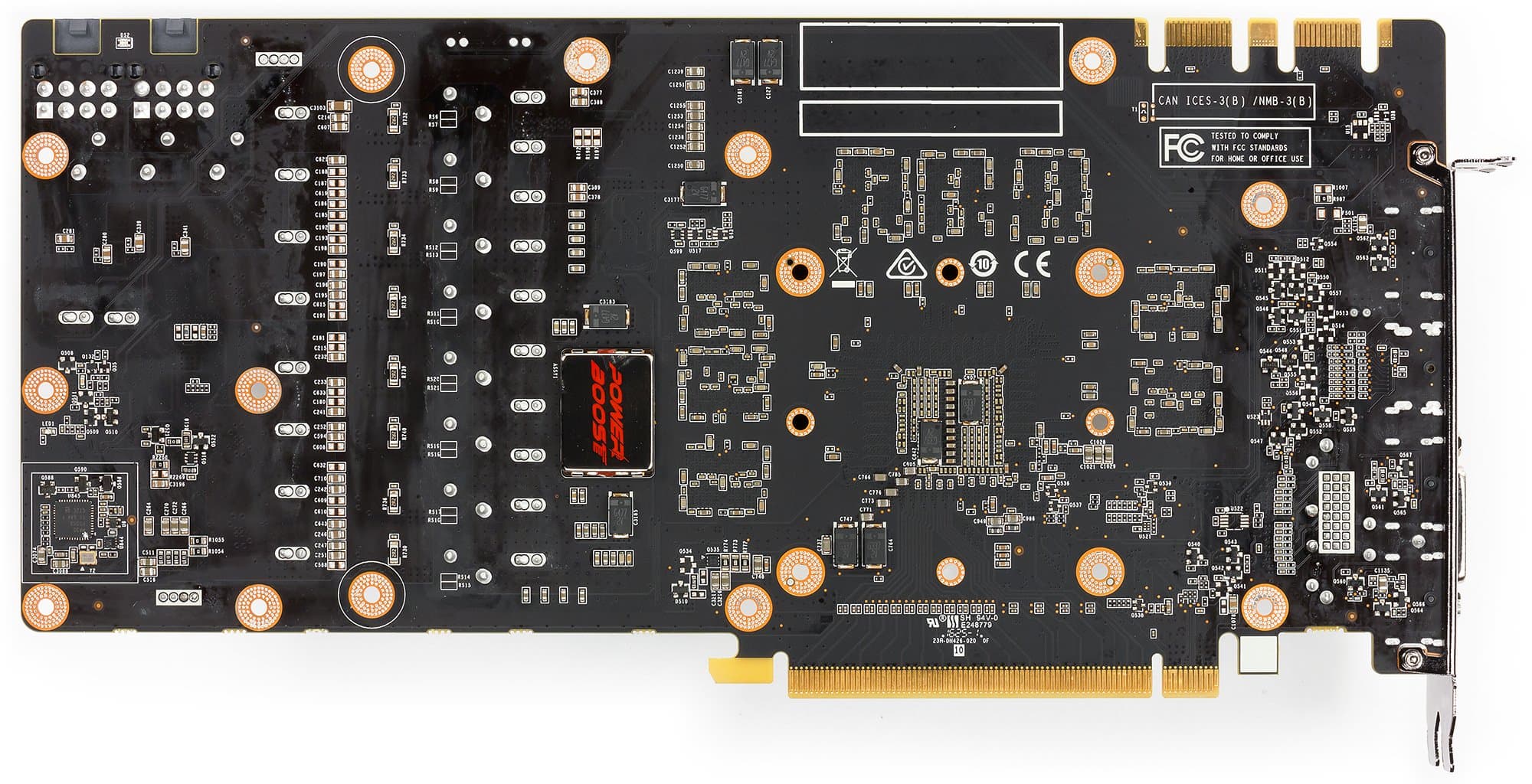 Схема питания имеет 10 фаз (8+2) и управляется цифровым контроллером uP9511P производства uPI Semiconductor. Видеокарта поддерживает технологию PowerBoost (особый конденсатор на оборотной стороне карты), которая предусматривает снижение количества случайных колебаний мощности (флуктуаций) и убирает пульсирующие помехи. Все это продлевает жизнь видеокарте.