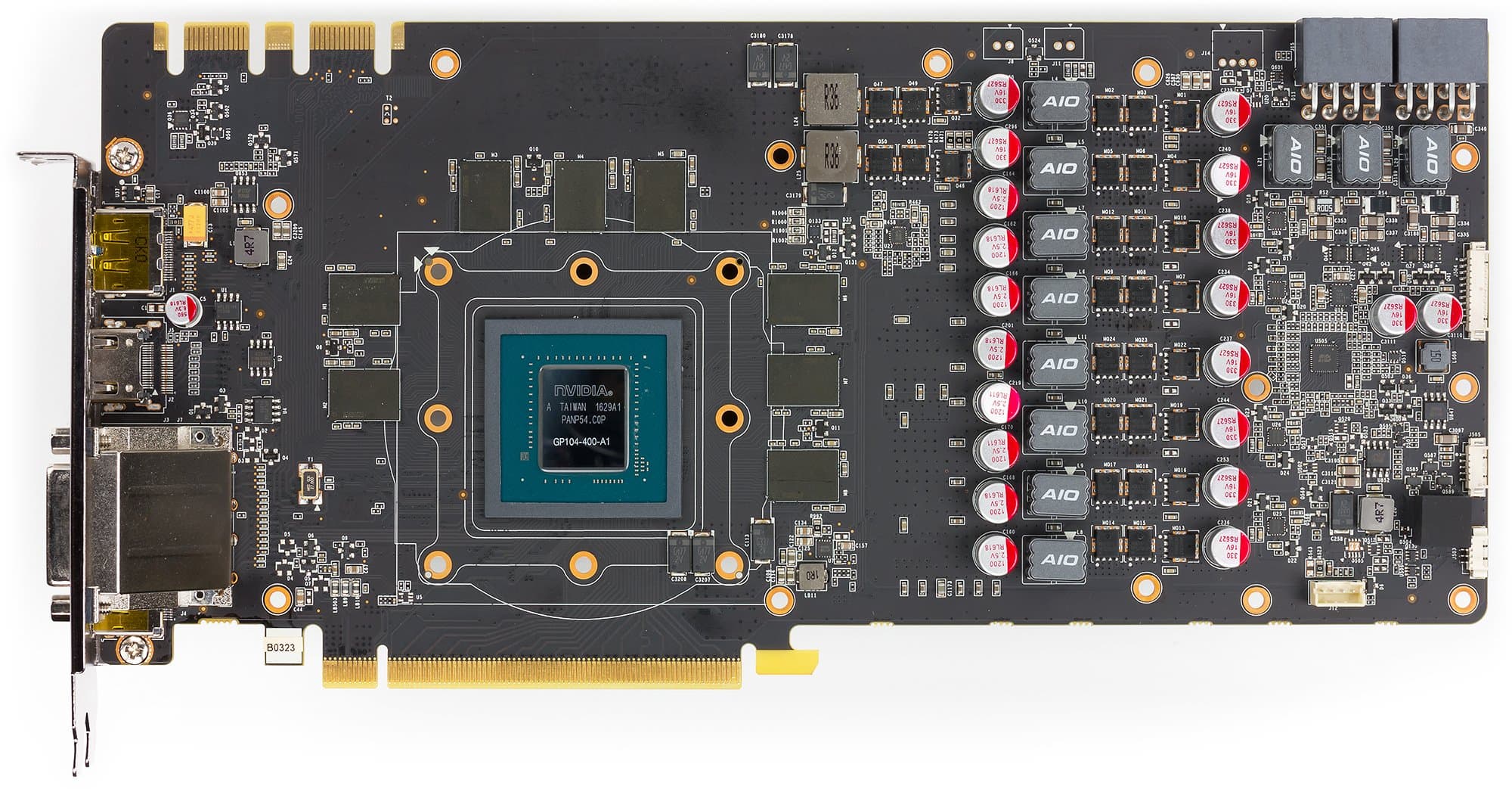 Карта имеет 8 ГБ памяти GDDR5X SDRAM, размещенной в 8 микросхемах по 8 Гбит на лицевой сторонe PCB. Микросхемы памяти Micron (GDDR5X). Микросхемы рассчитаны на номинальную частоту работы в 2500 (10000) МГц. | ![]() |