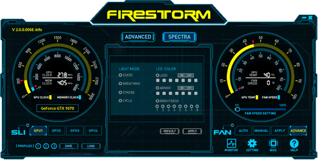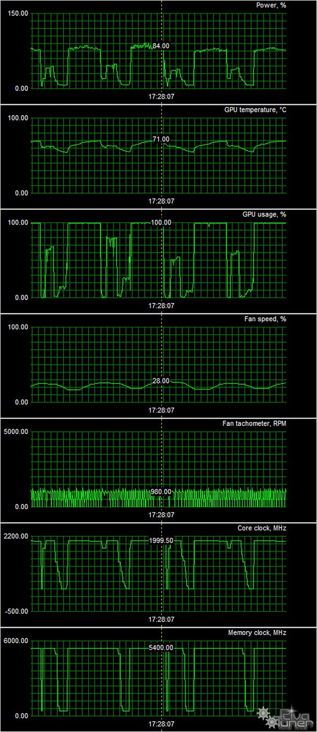 Частоты работы этого ускорителя серьезно повышены (на 9,5% по ядру) относительно стандартных параметров референс-карты, что может обеспечить прирост производительности в районе 8% в зависимости от разрешения и режима работы. Используя вышеназванную утилиту, мы попробовали еще больше разогнать ускоритель. Стабильность под нагрузкой сохранялась до частот 1850—2138 МГц по ядру и 11200 МГц по памяти. По итоговой частоте наша разогнанная карта уже почти на 13% обгоняла референсную, и прирост производительности может быть весьма приличным.
