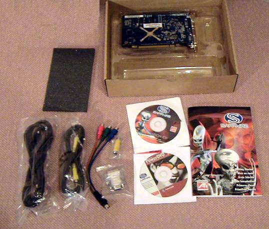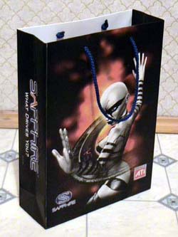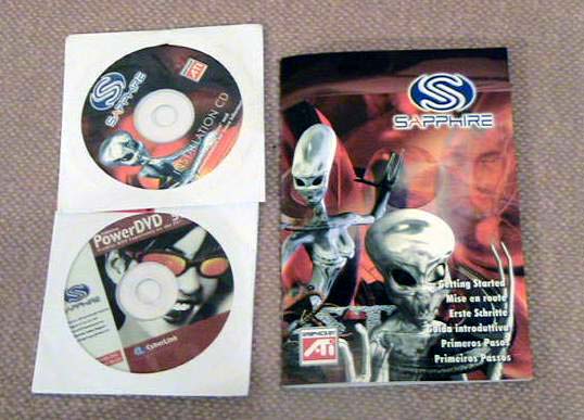 Карта поставляется в коробке, которая находится в стильной сумочке с логотипом Sapphire. В такой сумке ее очень удобно донести до дома. ![]() На коробочке изображено грустное существо, подсознательно вызывающее ассоциации с Чебурашкой, подвергнутым неким негуманным экспериментам. Гуманоид, однако, вполне симпатичный и внушающий симпатию )). В коробке имеется вырез, через который можно наблюдать видеокарту, что весьма удобно - видишь что покупаешь. ![]() ![]() Открым коробку мы видим, что она под завязку забита. В комплекте были обнаружены: