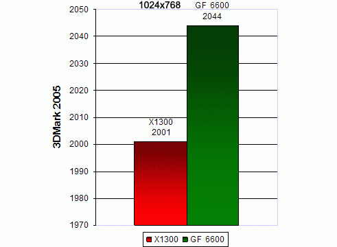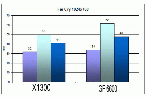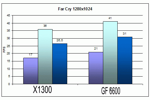 Традиционно будет правильно начать с синтетических тестов. В качестве первого испытания хотелось бы проверить на тесте 3DMark 2001 SE, который стал последнее время тестом общей производительности системы. ![]() В общем картина для Х1300 не очень радостная, разрыв в 2000 «попугая» это не мало. Далее не потерявший своей актуальности 3DMark 2003 ver 3.60: ![]() Дааа… Тут ситуация чуть более трагична: разница 12% в пользу GF 6600 И наконец популярный нынче 3DMark 2005 ver.1.20 : ![]() Ну а тут всё в получше чем до этого. Разрыва почти нет. Бенчмарки и синтетические тесты это конечно хорошо, но реальные игры представляют куда больший интерес. Ведь на них вы будете смотреть а не на тесты. К тому же с каждой новой версией драйверов для видеокарт оптимизации под тест затачивается, т.к. многие люди выбирают девайс который набрал большее количество очков. Переходя к игровым тестам хотелось бы пояснить о том что я измерял помимо среднего количества кадров в секунду, еще и минимальное и максимальное значение, т.к. кол-во FPS изменяется в большом диапазоне. Хотелось бы начать с классического шутера FarCry v1.31