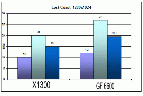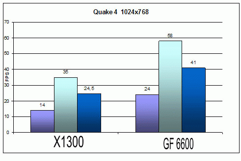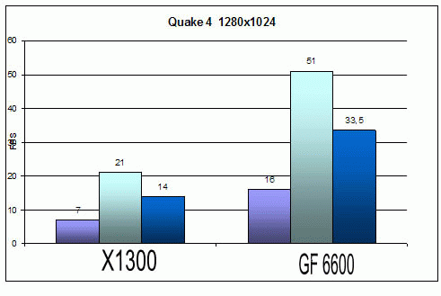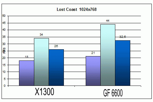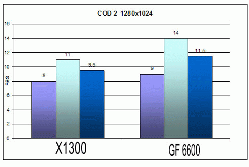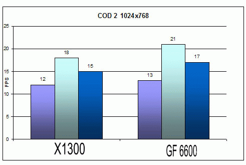Качество: High ![]() ![]() Ну что же на обоих картах поиграть можно т.к. минимальное количество FPS не меньше 30 при 1024х768. ![]() А вот при разрешении 1280х1024 уже не все так радужно. Минимальное количество кадров 17 у Х1300 и 21 у GF 6600. Странно то что этот шутер как правило отдавал предпочтение видеокартам на чипсетах ATI. Следующим игровым тестом будет Call Of Duty 2.