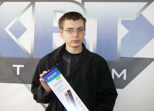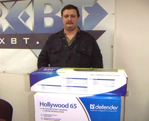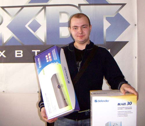 Данная викторина потребовала от читателей iXBT.com некоторых знаний о сетевых фильтрах и стабилизаторах, которые выпускаются под маркой Defender. Среди всех правильно ответивших была проведена жеребьёвка, результатом которой стало выявление тринадцати имён и электронных адресов счастливчиков, трое из которых получат основные призы, а ещё десять получат поощрительные призы в виде сетевых фильтров Defender DFS 401. Первый приз: сетевой фильтр Defender SMART 100 и активная акустическая система 5.1 Defender Hollywood 65 будет вручён Маркову Александру с жлектронным адресом markovalexandr@....com как только он откликнется на наше письмо. ![]() Второй приз: сетевой фильтр Defender SMART 100 и активная акустическая система 2.1 Defender Blaze 45 отправится в город Орёл, к Алексею Лукину И, наконец, третий приз: сетевой фильтр Defender SMART 100 и активная акустическая система 2.1 Defender Blaze 30, будет вручён Божко Николаю в редакции iXBT.com. ![]() За призом приехал коллега Николая. 10 поощрительных призов – сетевые фильтры Defender DFS 401 будут вручены или отправлены следующим участникам мероприятия правильно ответивших на вопросы викторины: